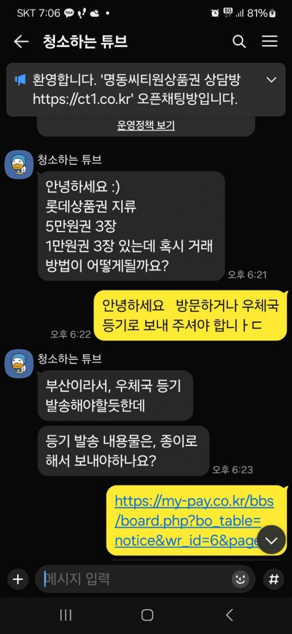 부산 금정구 롯데 백화점 상품권 고객님 우편 등기 매입