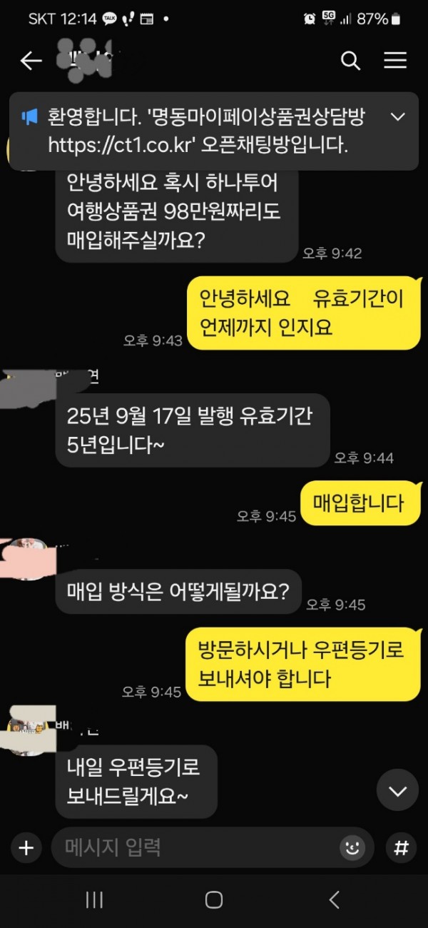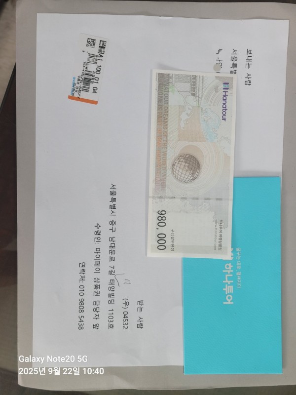 하나투어 상품권 98만원을 우편등기로 보내주셨습니다.