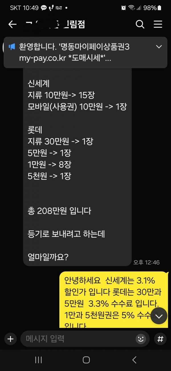 명동마이페이상품권 010-9808-5438 카톡 문의