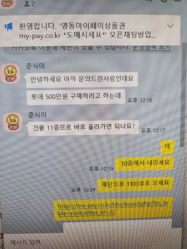 카톡으로 문의후 롯데 상품권 5백만원 구매