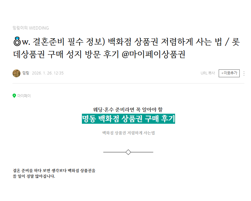 플레이스 리뷰 남겨주신 고객님께 감사드립니다”마이페이를 이용해 주시고, 플레이스에 정성스러운 리뷰까지 남겨주신 고객님께 감사의 마음으로 커피 쿠폰을 보내드렸습니다.고객님의 좋은 후기 한 줄이 처음 방문하시는 분들께는 큰 신뢰와 도움이 됩니다.명동상품권, 상품권 시세 상담, 예물·명품 구매 목적 등으로 방문해 주시는 모든 분들께 항상 투명하고 정확한 안내로 알뜰하고 만족스러운 구매가 되실 수 있도록 노력하겠습니다.감사합니다.w. 결혼준비 필수 정보) 백화점 상품권 .. : 네이버블로그 – 마이페이 명동상품권 –